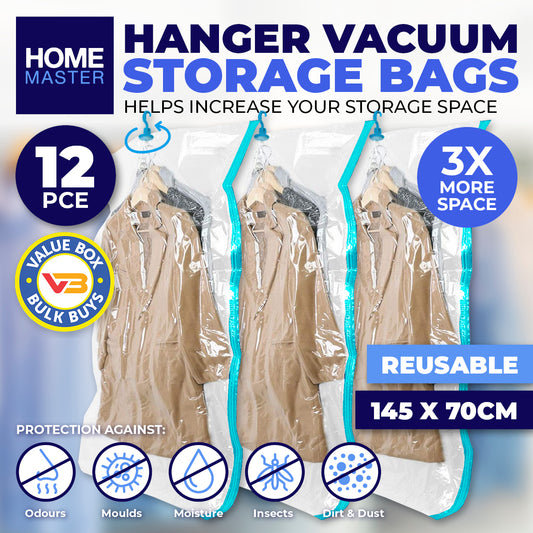 Home Master 12PCE Hanging Vacuum Storage Bag Re-Usable Space Saver 70 x 145cm