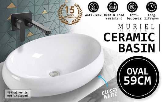Muriel 59 x 40 x 14.5cm White Ceramic Bathroom Basin Vanity Sink Oval Above Counter Top Mount Bowl