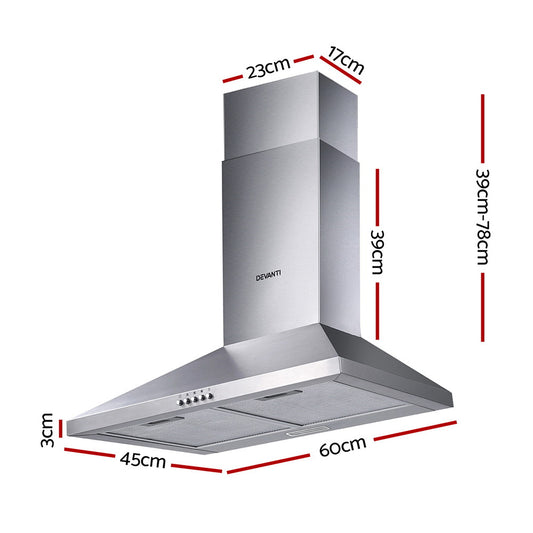 Devanti Range Hood 60cm 600mm Kitchen Canopy Stainless Steel Rangehood Wall Mount