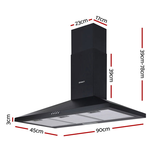 Devanti Range Hood Rangehood 90cm 900mm Kitchen Canopy LED Light Wall Mount Black