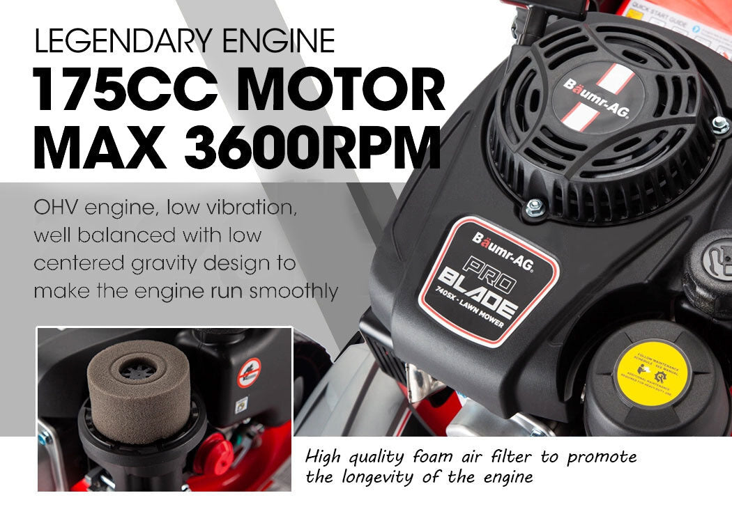 The 740SX lawn mower boasts high quality components which includes advanced four-stroke OHV technology that blends a high power output with easy starting and efficiency. The large and effortlessly powerful air cooled 175cc engine slices through the toughest buffalo with ease.