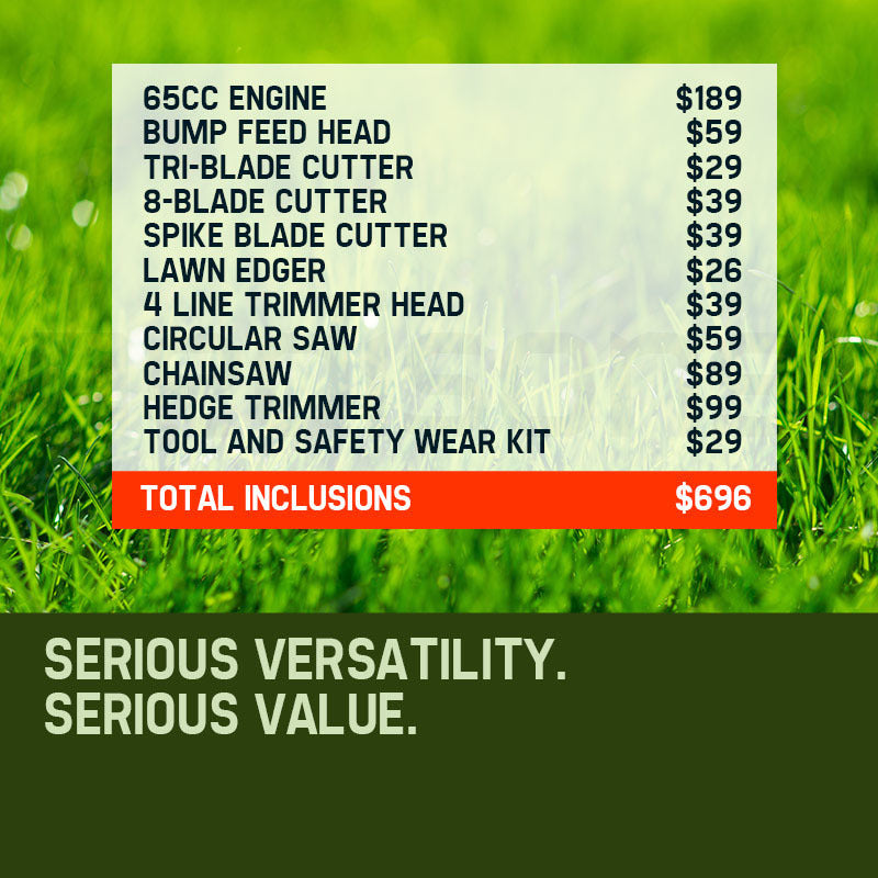 - BONUS ACCESSORY KIT (toolkit, gloves, ear muffs, shoulder strap, fuel mixer)